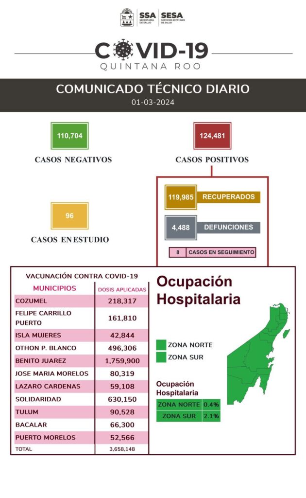 Hasta el 01 de marzo de 2024 han sido 124 mil 481 casos positivos de COVID-19 en Quintana Roo.